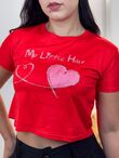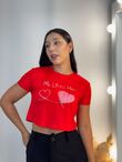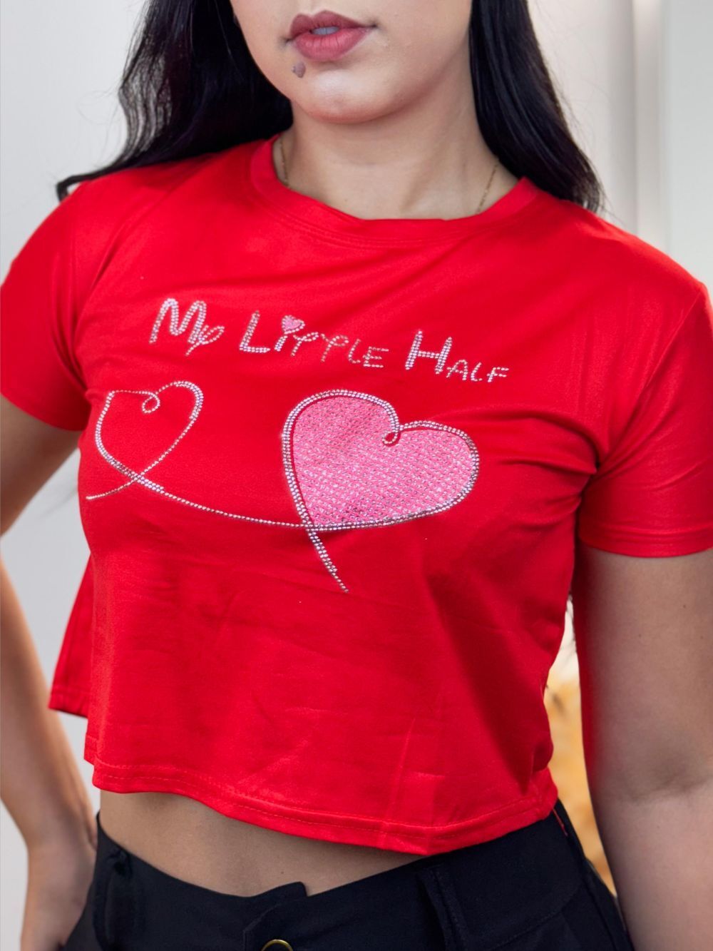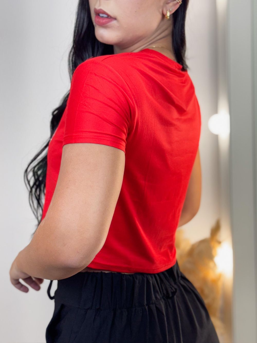 Cropped estilo T-shirt, modelagem estilo camiseta mais curta.