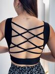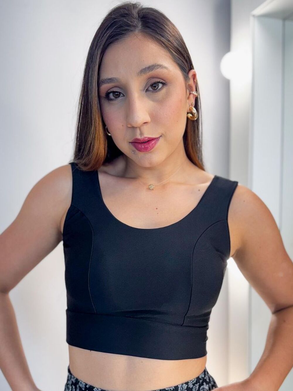 Cropped com bojo em poliamida e detalhes nas costas, modelo de usar mais comprido.