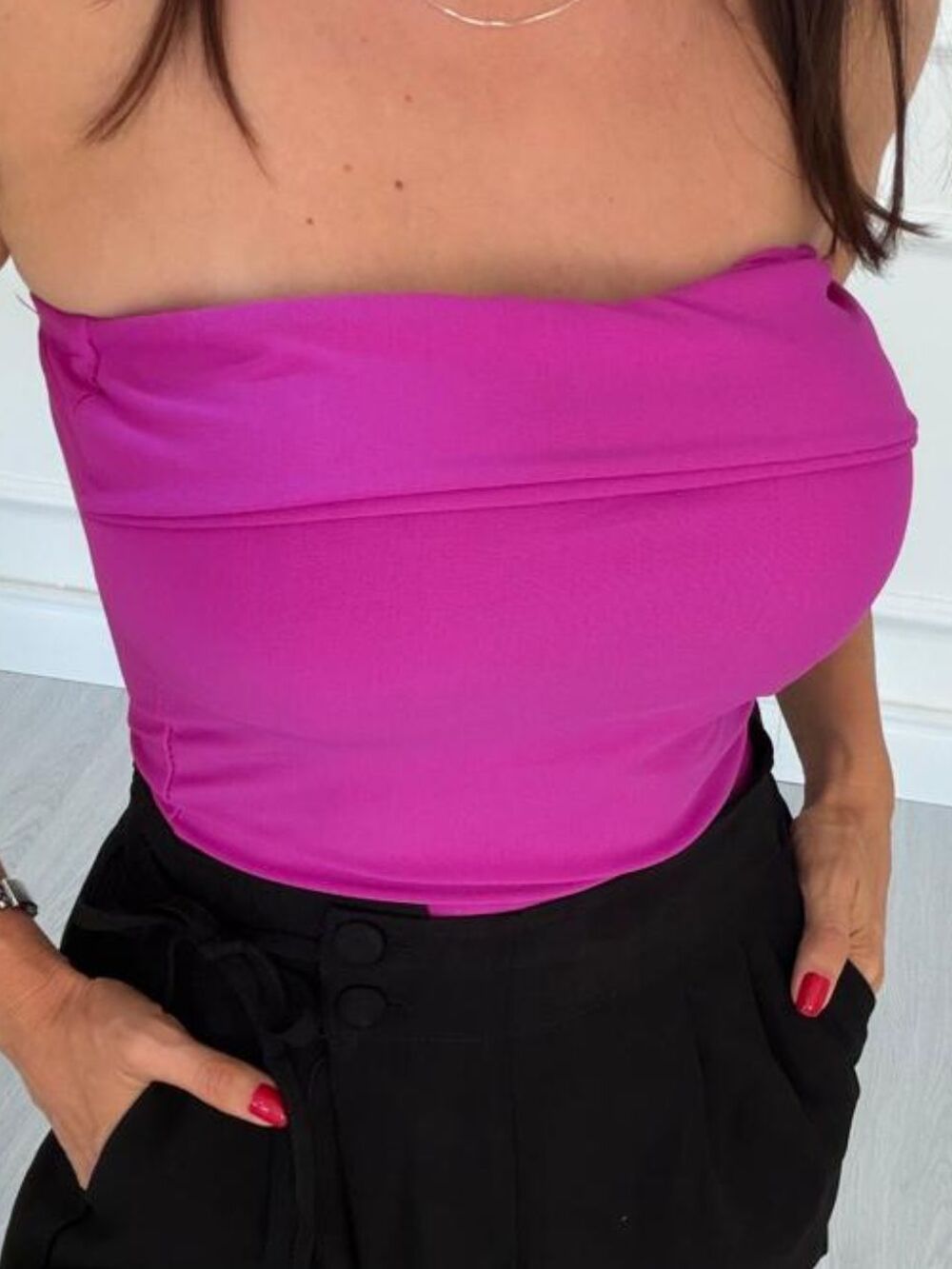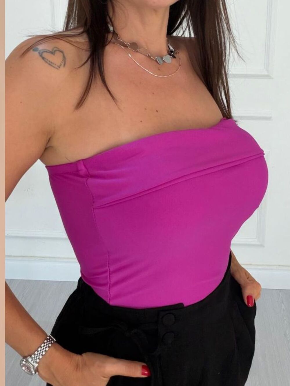 Cropped tomara que caia com bojo de poliamida com poliester estilo blusinha mais comprido.