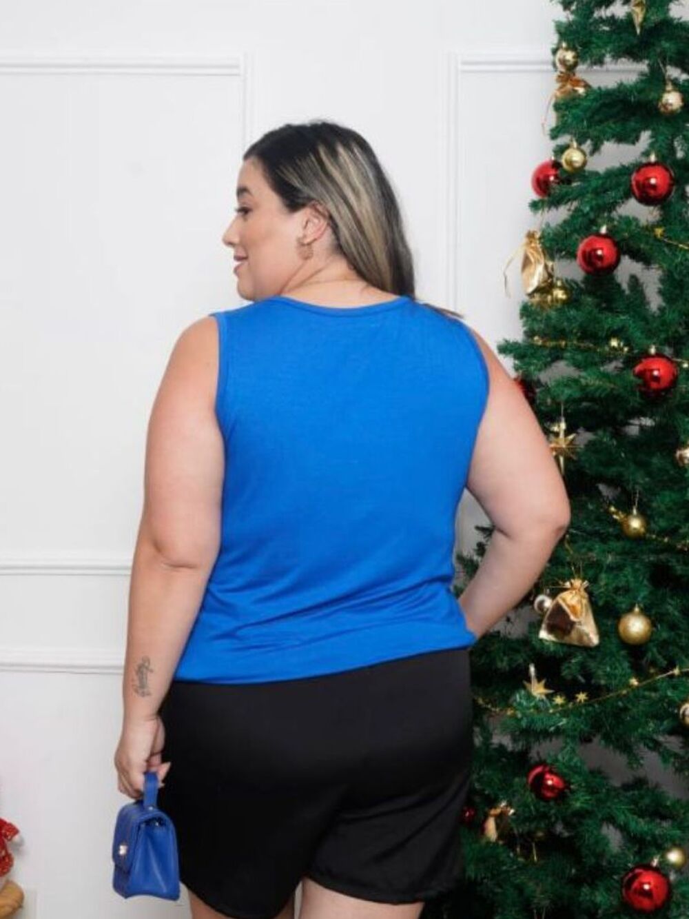 Blusa regata feminina confeccionada em malha de toque macio e caimento leve. Possui recorte frontal em formato de V com detalhe pespontado, que valoriza o busto e traz um charme discreto à peça. O modelo tem gola arredondada e acabamento delicado nas cavas, garantindo conforto e um visual moderno. Ideal para compor produções casuais e elegantes, combinando com saias, calças ou shorts em diferentes estilos.