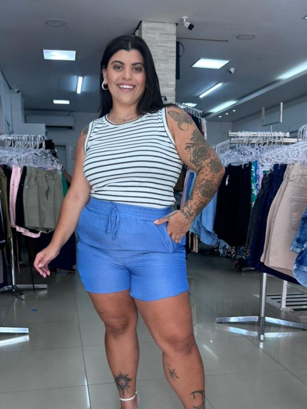 Shorts jeans plus molinho com elástico na cintura não precisa fazer ajustes. Modelo importado material diferente bem leve e molinho